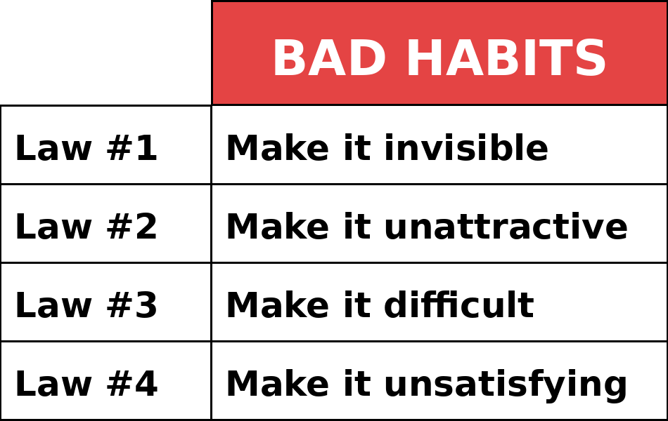 Just as it’s important to develop good habits, it’s often necessary to break bad ones. Unsurprisingly, the steps for breaking a bad habit are the reverse of the four laws for developing good ones.